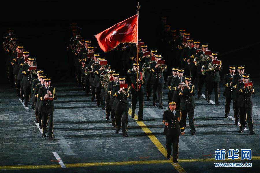 8月23日,在俄罗斯莫斯科,来自土耳其的乐团在军乐节上表演。 俄罗斯“救世主塔楼”国际军乐节23日晚在莫斯科红场开幕,将持续至9月1日。 新华社发(叶甫盖尼·西尼岑摄)