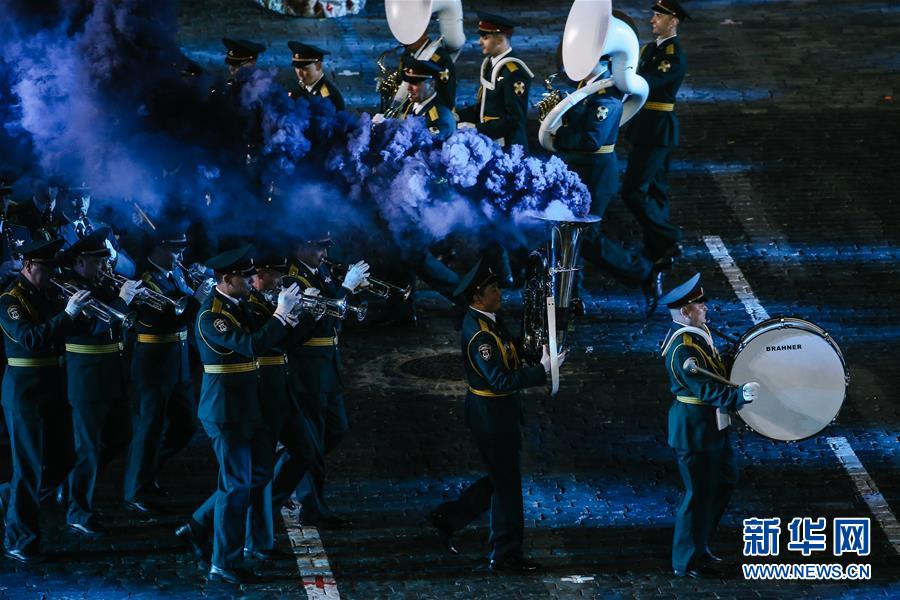 8月23日,在俄罗斯莫斯科,俄罗斯的一支乐团在军乐节上表演。 俄罗斯“救世主塔楼”国际军乐节23日晚在莫斯科红场开幕,将持续至9月1日。 新华社发(叶甫盖尼·西尼岑摄)