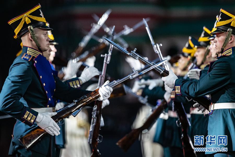 8月23日,在俄罗斯莫斯科,俄罗斯总统卫队在军乐节上表演。 俄罗斯“救世主塔楼”国际军乐节23日晚在莫斯科红场开幕,将持续至9月1日。 新华社记者白雪骐摄