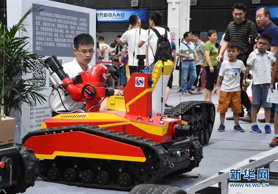 观众在2019世界机器人大会上参观消防机器人(8月22日摄)。 新华社发(任超 摄)
