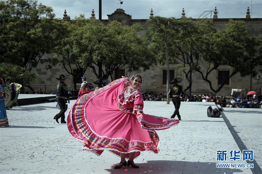 8月24日,在墨西哥西部城市瓜达拉哈拉,一名街头乐队表演者跳起舞蹈。新华社发(伯纳德特·戈麦斯摄)