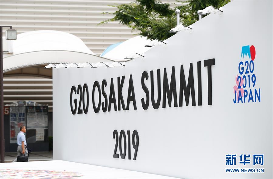这是2019年6月27日在日本大阪拍摄的G20大阪峰会新闻中心入口处的标志。 新华社记者 王婧嫱 摄