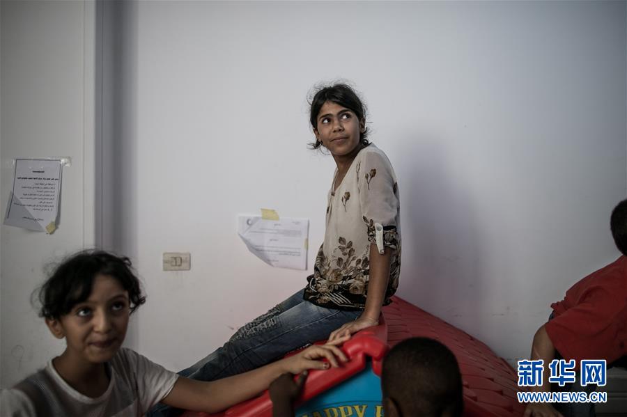 8月28日,在利比亚首都的黎波里,马吉达(中)和其他流离失所的儿童生活在一栋废弃楼房中。新华社发(阿姆鲁摄)