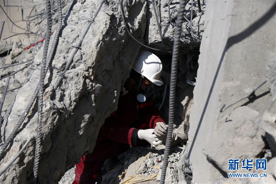 9月1日,在也门扎马尔省,救援人员在遭到空袭的建筑物废墟搜寻遇难者遗体。 也门胡塞武装1日说,沙特阿拉伯领导的多国联军战机1日凌晨空袭了也门西南部扎马尔省的一所监狱,造成至少50名战俘死亡。 新华社发(穆罕默德 摄)