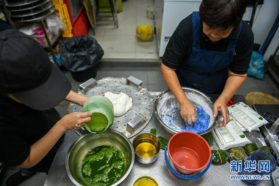 9月1日,在马来西亚吉隆坡,郑桂玲(左)和母亲姚秀蓝在自己的餐厅内制作娘惹糕。 9月13日,中国将迎来传统佳节——中秋节。月饼作为中秋节的传统糕点,久负盛名,备受人们喜爱。那么世界上的其他地区是否也有自己独特的传统糕点,让人食之难忘呢?答案是肯定的。 在马来西亚,早期的中国移民与当地人的后代被称为峇峇娘惹,男性称峇峇,女性叫娘惹,是东南亚土生华人族群。峇峇娘惹保留了中华传统习俗,同时也吸收了当地马来人的文化,他们的美食同样兼具了中马两国的特色,娘惹糕是其中的代表之一。娘惹糕由糯米、椰浆、香料等原料制成,口感软糯,种类及口味繁多。糕点取用蝶豆花、班兰叶等植物的汁液上色,形成艳丽的色彩,是备受当地人欢迎的美食。 新华社发(张纹综摄)