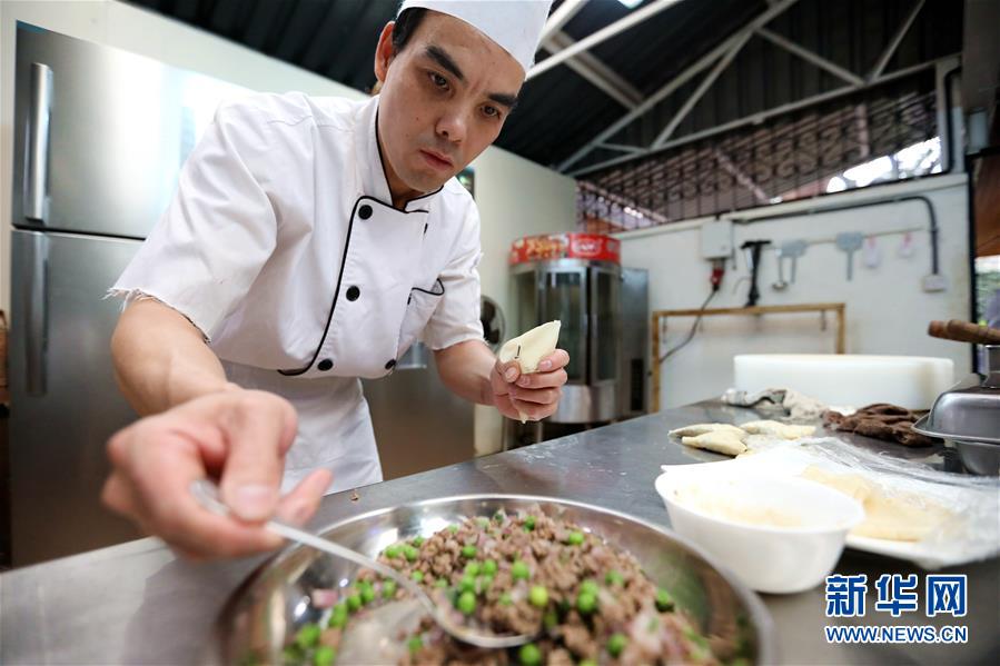 8月29日,在肯尼亚内罗毕的一家中餐厅,一名中国厨师制作萨摩萨。 新华社记者王腾摄