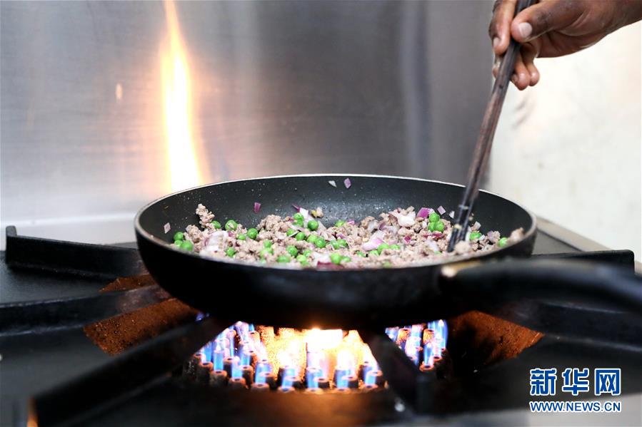 8月29日,在肯尼亚内罗毕的一家中餐厅,一名当地厨师炒制萨摩萨的馅料。 新华社记者王腾摄