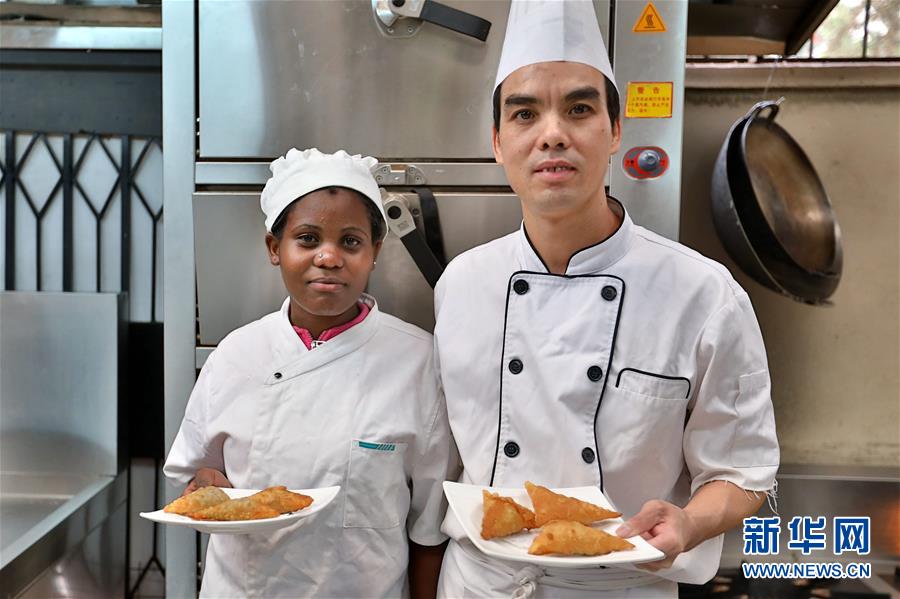 8月29日,在肯尼亚内罗毕的一家中餐厅,两名厨师展示做好的萨摩萨。新华社记者王腾摄