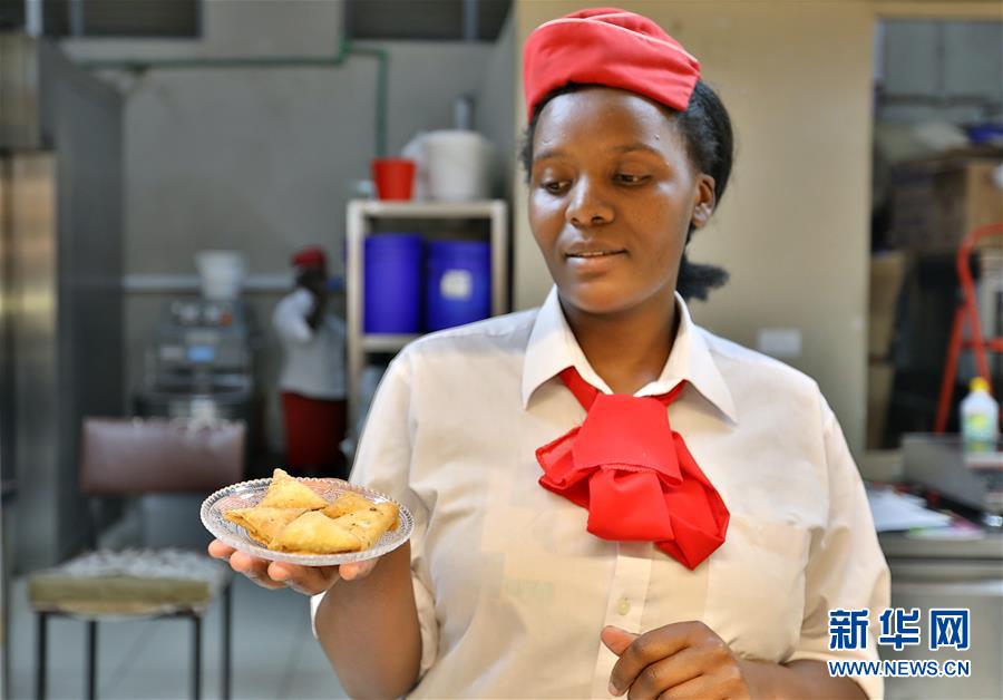 8月26日,在肯尼亚内罗毕的一家超市,一名售货员展示出售的萨摩萨。 新华社记者王腾摄