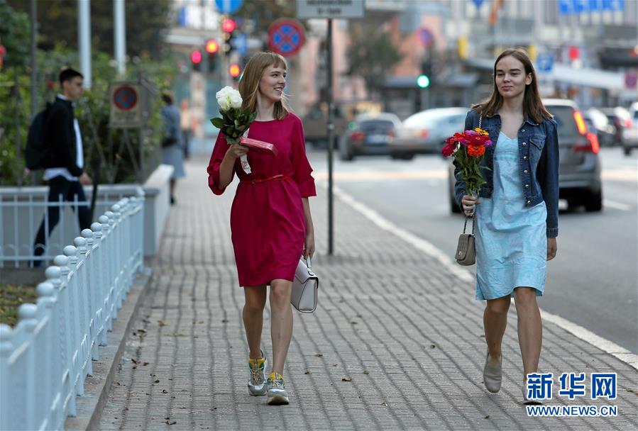 9月2日,在拉脱维亚首都里加,学生们手持鲜花,准备参加开学典礼。 当日,拉脱维亚开始了2019-2020新学年。 新华社发(艾迪斯摄)