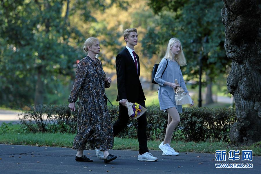 9月2日,在拉脱维亚首都里加,学生们手持鲜花,准备参加开学典礼。 当日,拉脱维亚开始了2019-2020新学年。 新华社发(艾迪斯摄)