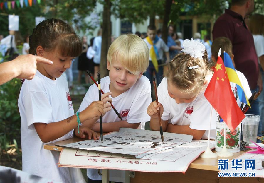 9月2日,在乌克兰基辅第一东方语言学校开学典礼上,学生们学写毛笔字。 当天,乌克兰基辅市第一东方语言学校举行开学典礼,同学们在典礼上进行了舞龙、舞狮、武术等表演,用“中国风”迎接新学年的开始。 新华社发(谢尔盖·斯塔拉斯坚科 摄)