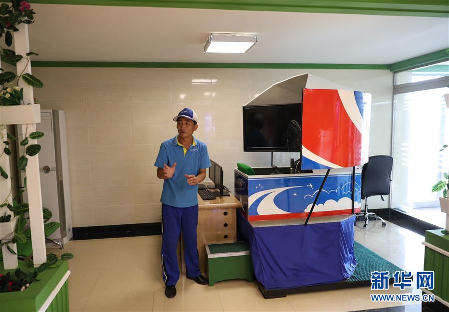 8月29日,在朝鲜平壤美林航空俱乐部,工作人员站在飞行模拟机旁进行介绍。新华社记者 程大雨 摄