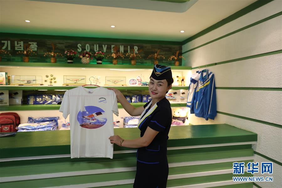 8月29日,在朝鲜平壤美林航空俱乐部,讲解员展示印有俱乐部标志的纪念衫。新华社记者 程大雨 摄