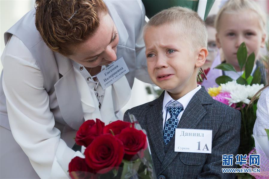 9月2日,在俄罗斯圣彼得堡,一名老师安慰一名哭泣的一年级新生。 当日是俄罗斯学校新学期开学日。小学一年级的新生们在新鲜、欢笑和哭泣中开始了求学生涯。 新华社发(莫京娜 摄)