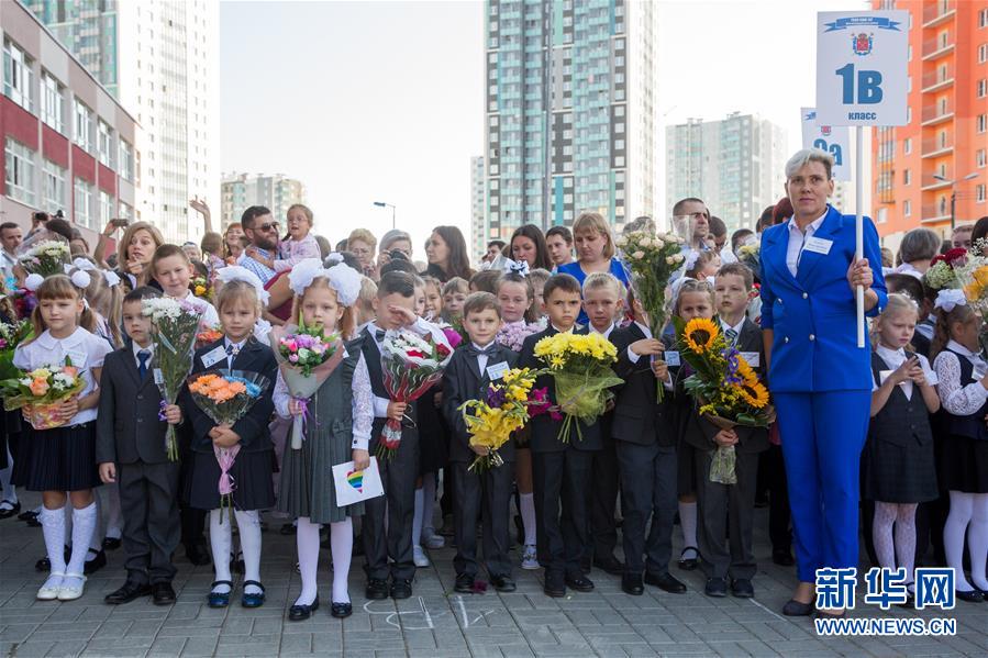 9月2日,在俄罗斯圣彼得堡,一年级新生和老师在一起参加开学典礼。 当日是俄罗斯学校新学期开学日。小学一年级的新生们在新鲜、欢笑和哭泣中开始了求学生涯。 新华社发(莫京娜 摄)