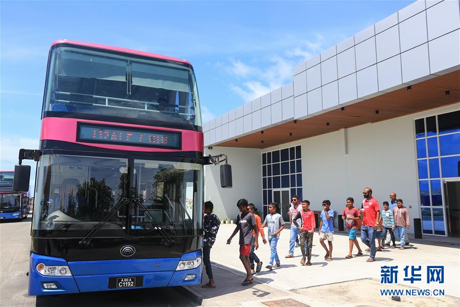 9月1日,位于马尔代夫首都马累的大马累公交线公交总站,旅客排队上车。马累街道非常狭窄,中马友谊大桥通车前这里没有巴士。去年,随着大桥通车,马尔代夫政府开设了大马累公交线。 新华社发(王明亮摄)