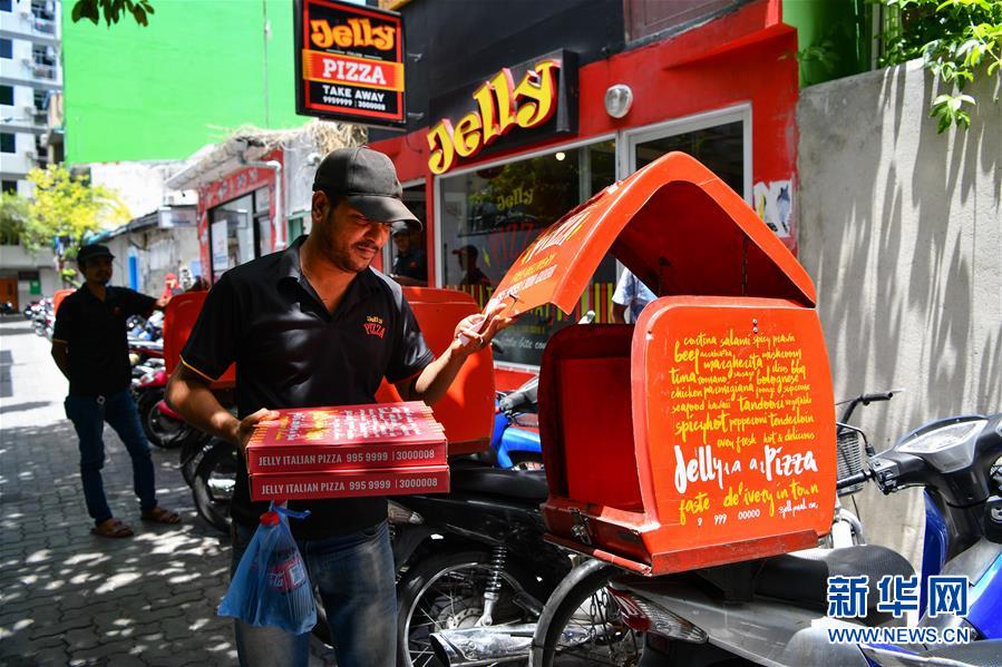9月1日,在马尔代夫首都马累的一家披萨店门口,快递员加汗吉尔准备为客户送餐。中马友谊大桥通车后,跨岛外卖服务成为很多餐饮店的标配服务,不少店甚至可以免费跨岛送货上门。 新华社发(杜才良摄)
