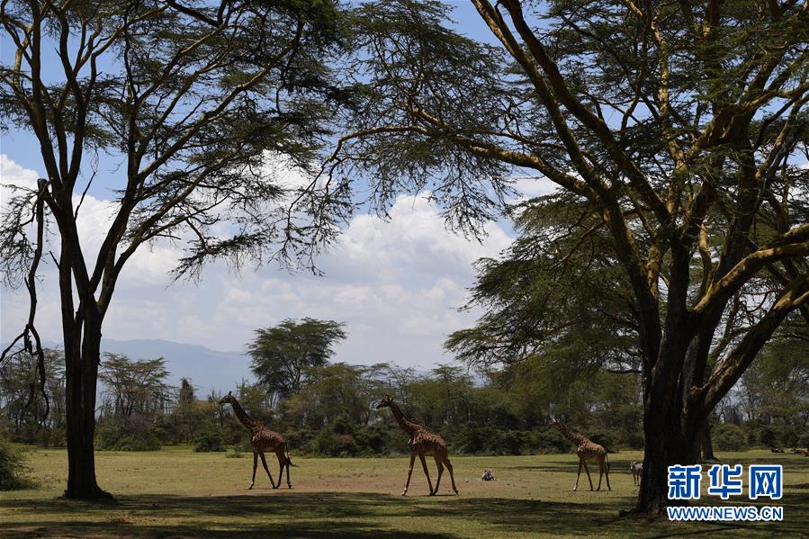 2018年10月4日,长颈鹿漫步在肯尼亚纳瓦沙湖附近。新华社记者 李琰 摄