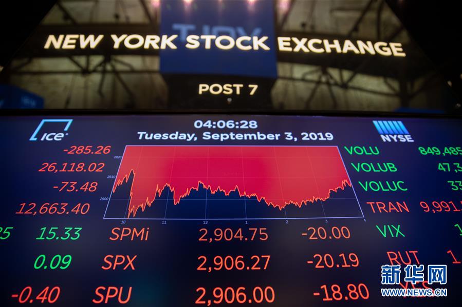 9月3日,在美国纽约证券交易所,电子屏显示当天交易情况。 纽约股市三大股指3日下跌。截至当天收盘,道琼斯工业平均指数比前一交易日下跌285.26点,收于26118.02点,跌幅为1.08%。标准普尔500种股票指数下跌20.19点,收于2906.27点,跌幅为0.69%。纳斯达克综合指数下跌88.72点,收于7874.16点,跌幅为1.11%。 新华社记者郭沛然摄