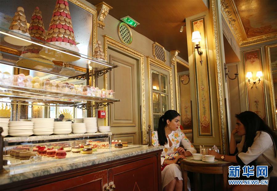 9月3日,在法国巴黎,两名女子在知名马卡龙甜品店拉迪雷内交谈。新华社记者 高静 摄