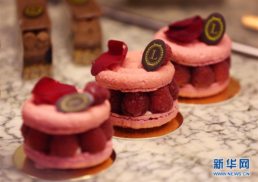 这是9月3日在法国巴黎知名马卡龙甜品店拉迪雷内拍摄的马卡龙覆盆子口味甜点。新华社记者 高静 摄