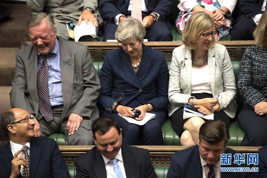 9月3日,在英国伦敦,前首相特雷莎·梅(后排中)在英国议会下院出席会议。 英国议会下院3日通过了一项从保守党领导人、首相约翰逊手中夺取议会议程控制权的动议。约翰逊随后警告,如果议会通过延迟“脱欧”议案,他将要求解散议会并提前举行大选。 新华社发(英国议会摄影师杰西卡·泰勒摄)