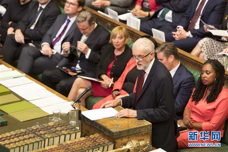 9月3日,在英国伦敦,英国工党领袖科尔宾(前)在英国议会下院发言。 英国议会下院3日通过了一项从保守党领导人、首相约翰逊手中夺取议会议程控制权的动议。约翰逊随后警告,如果议会通过延迟“脱欧”议案,他将要求解散议会并提前举行大选。 新华社发(英国议会摄影师罗杰·哈里斯摄)