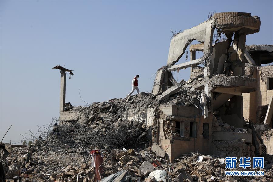 9月4日,在也门扎马尔省,一名救援人员搜寻空袭遇难者遗体。 也门西南部扎马尔省一所监狱1日凌晨遭到空袭,目前已有至少100人死亡,预计这一数字还会上升。 新华社发(穆罕默德摄)