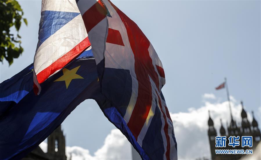 这是9月4日在英国伦敦的议会大厦外拍摄的英国国旗和欧盟旗帜。 英国议会下院3日以328票赞成、301票反对的表决结果,通过从保守党领导人、首相约翰逊手中夺取议会议程控制权的动议。动议通过后,议会下院4日将就“无协议脱欧”议案进行辩论投票。 新华社记者 韩岩 摄