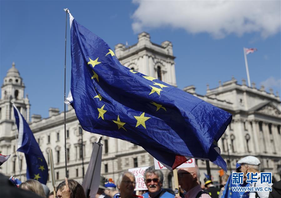 这是9月4日在英国伦敦的议会大厦外拍摄的欧盟旗帜。 英国议会下院3日以328票赞成、301票反对的表决结果,通过从保守党领导人、首相约翰逊手中夺取议会议程控制权的动议。动议通过后,议会下院4日将就“无协议脱欧”议案进行辩论投票。 新华社记者 韩岩 摄