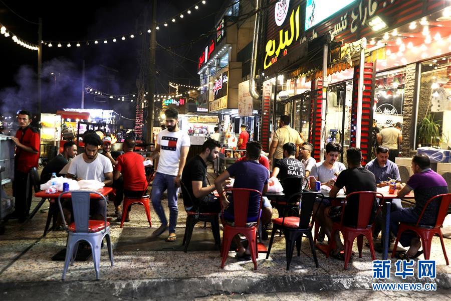 9月2日,在伊拉克首都巴格达,人们在街边餐馆消费。 随着安全形势逐步改善,久违的夜生活重新出现在伊拉克首都巴格达,当地民众在夏夜有了多种休闲消遣的选择。 新华社发(哈利勒·达伍德摄)
