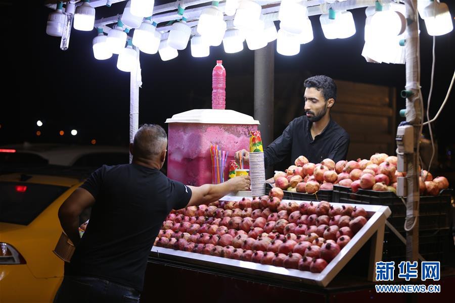 9月2日,在伊拉克首都巴格达,一名商贩在街头售卖果汁。 随着安全形势逐步改善,久违的夜生活重新出现在伊拉克首都巴格达,当地民众在夏夜有了多种休闲消遣的选择。 新华社发(哈利勒·达伍德摄)