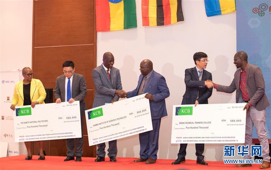 9月3日,在肯尼亚首都内罗毕,新设立的“金也淘奖学金”在第六届非洲职业技能挑战赛闭幕式上发放。 肯尼亚教育部与中国航空技术国际控股有限公司(中航国际)联合举办的第六届非洲职业技能挑战赛5日在肯尼亚首都内罗毕闭幕。本次大赛的比赛项目是数控车床,个人奖项前三名选手获得赴中国留学的机会,团体奖项前两名获得价值10万美元的订单。 新华社记者张宇摄