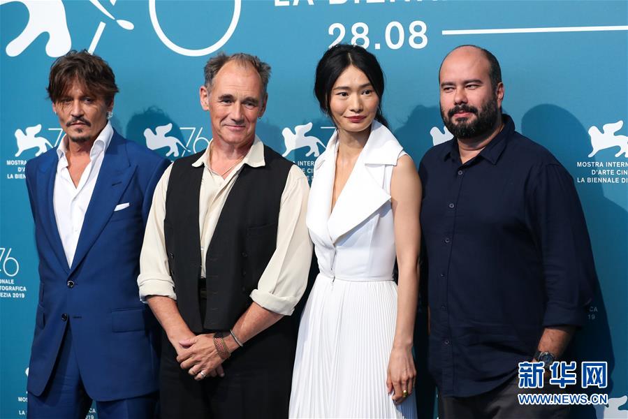 9月6日,在意大利威尼斯,导演西罗·格拉携主演加纳·巴亚尔赛汗、马克·里朗斯和约翰尼·德普(从右至左)出席电影《等待野蛮人》拍照式。 电影《等待野蛮人》入围第76届威尼斯电影节主竞赛单元。 新华社记者 张铖 摄
