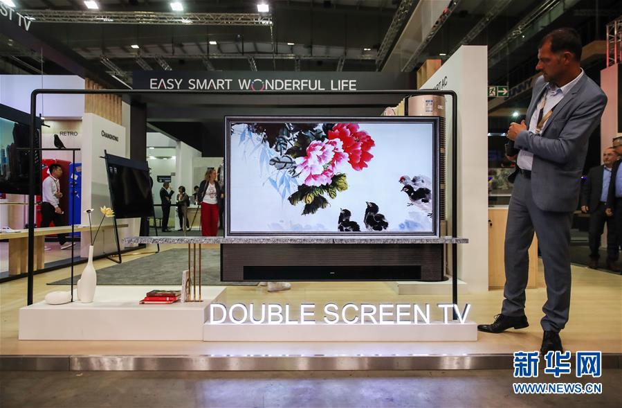 9月6日,在德国首都柏林举办的第59届柏林国际消费电子展上,一名参观者在长虹公司展区观看双屏电视。 中国家用电器创新成果推介活动6日亮相第59届柏林国际消费电子展,旨在以电子展为平台将更多中国家电创新成果推向世界舞台。第59届柏林国际消费电子展当天在柏林展览中心正式拉开帷幕,吸引了包括约770家中国企业在内的全球1939家展商参加。TCL、海尔、长虹、美的等中国知名家电品牌纷纷携最新产品和技术亮相电子展。 新华社记者单宇琦摄