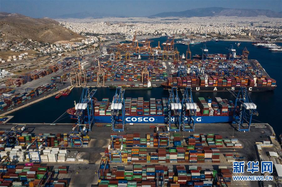 这是9月6日航拍的停靠在希腊比雷埃夫斯港集装箱码头的中远海运银河轮。 当日,来自意大利的进博会参展货物经希腊比雷埃夫斯港装船发往上海。 新华社发(莱夫特里斯·帕察里斯 摄)