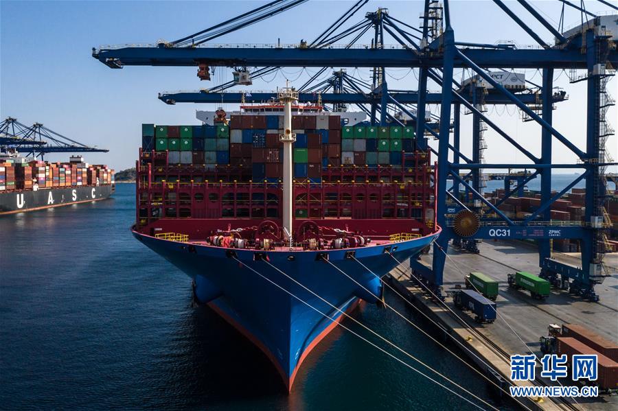 这是9月6日航拍的停靠在希腊比雷埃夫斯港集装箱码头的中远海运银河轮。 当日,来自意大利的进博会参展货物经希腊比雷埃夫斯港装船发往上海。 新华社发(莱夫特里斯·帕察里斯 摄)