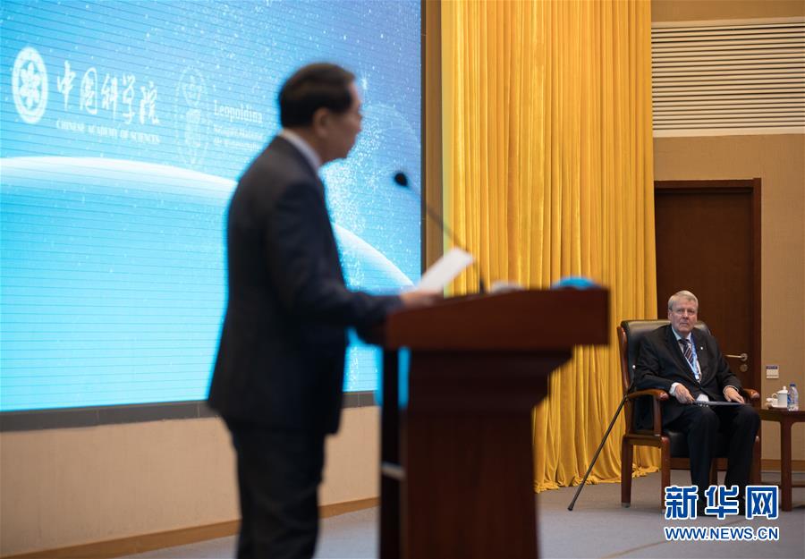 9月9日,中国科学院院长白春礼(左)致辞。右为德国国立科学院院长约尔格·哈克。新华社记者 金立旺 摄