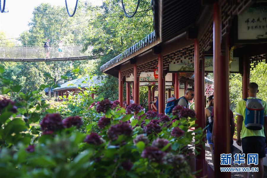8月24日,在比利时布吕热莱特市,游客参观天堂动物园的“中国园”中的一处长廊。新华社记者 郑焕松 摄