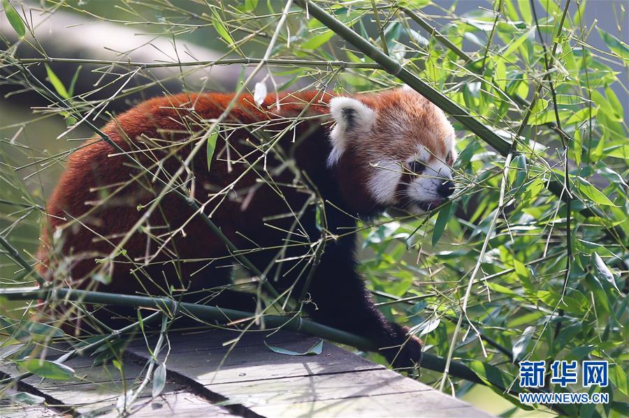 8月24日,在比利时布吕热莱特市,一只小熊猫在天堂动物园的“中国园”觅食。新华社记者 郑焕松 摄