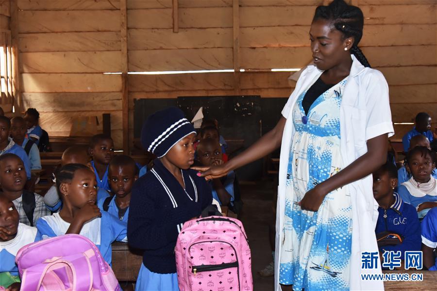 9月2日,在喀麦隆丰班,老师欢迎凯尔茜(中)来到新学校。新华社发(让·皮埃尔·科普索摄)
