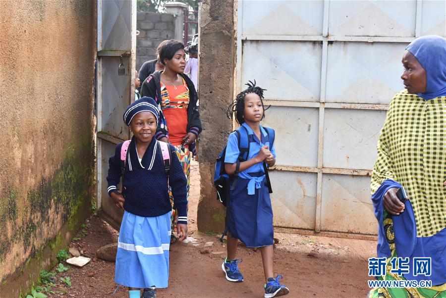 9月2日,在喀麦隆丰班,凯尔茜(前左一)走进新学校。新华社发(让·皮埃尔·科普索摄)