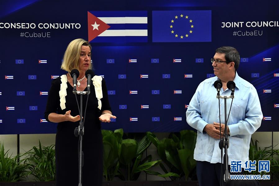 9月9日,在古巴哈瓦那,古巴外长罗德里格斯(右)与欧盟委员会副主席兼外交和安全政策高级代表莫盖里尼在第二届古巴—欧盟联合委员会会议后出席新闻发布会。新华社发(华金·埃尔南德斯摄)