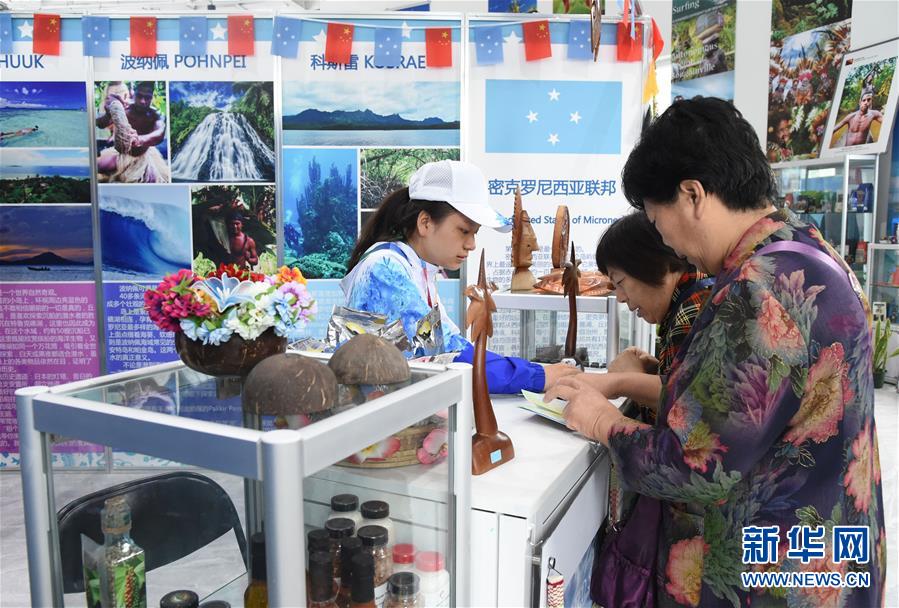 9月11日,游客在太平洋岛国联合展园中的密克罗尼西亚展区参观。新华社发(任超摄)