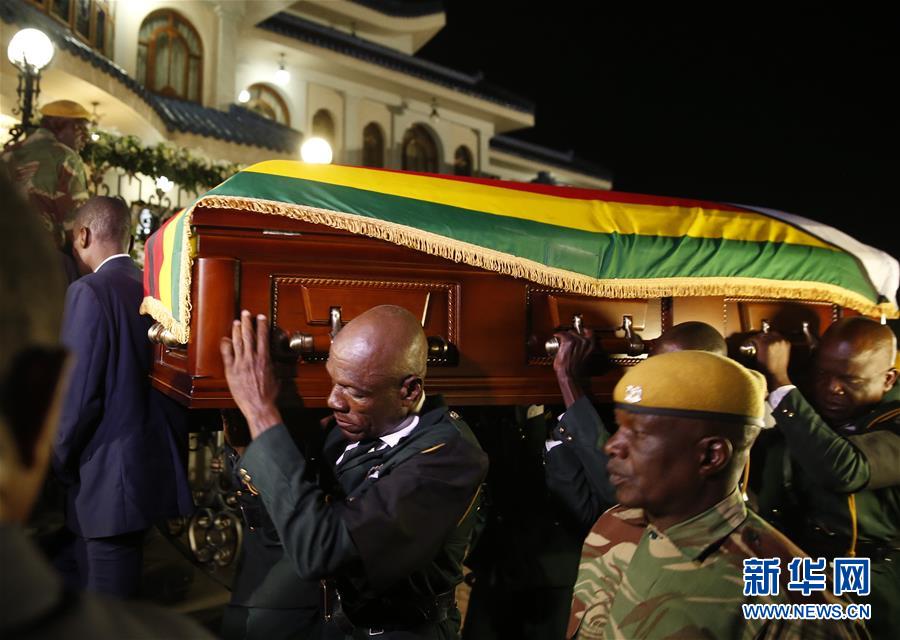 9月11日,在津巴布韦首都哈拉雷,前总统罗伯特·穆加贝的遗体运抵穆加贝的住所。 运送津巴布韦前总统罗伯特·穆加贝遗体的专机11日下午抵达哈拉雷。津巴布韦总统埃默森·姆南加古瓦等政要以及上千民众到机场迎接。 新华社发(肖恩·朱萨摄)