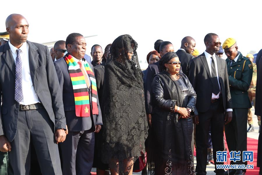 9月11日,在津巴布韦首都哈拉雷,津巴布韦总统埃默森·姆南加古瓦(前左二)等在机场迎接前总统罗伯特·穆加贝的遗体。 运送津巴布韦前总统罗伯特·穆加贝遗体的专机11日下午抵达哈拉雷。津巴布韦总统埃默森·姆南加古瓦等政要以及上千民众到机场迎接。 新华社发(陈雅琴摄)