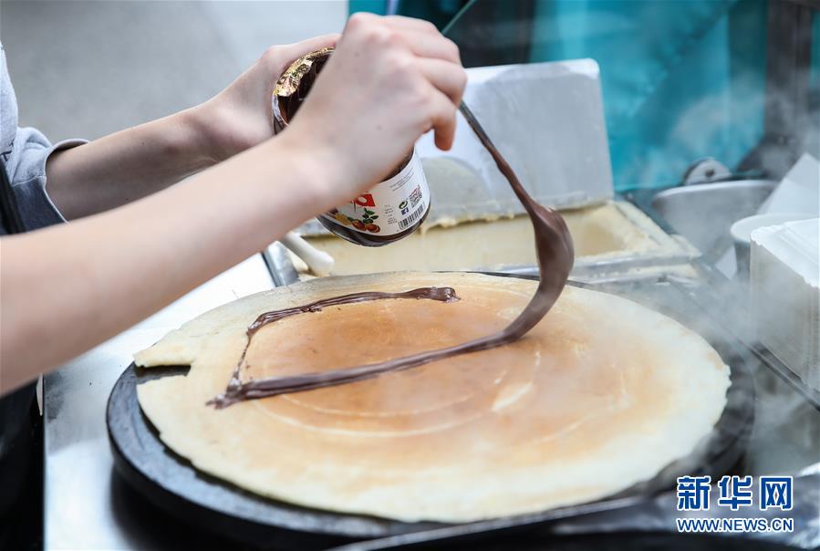 9月10日,在德国首都柏林,一名可丽饼摊位的工作人员将巧克力酱涂抹在即将完成的可丽饼上。