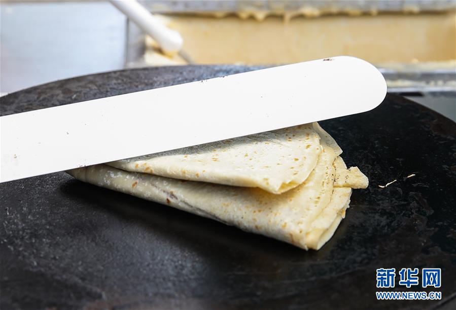9月10日,在德国首都柏林,一名可丽饼摊位的工作人员折叠可丽饼。