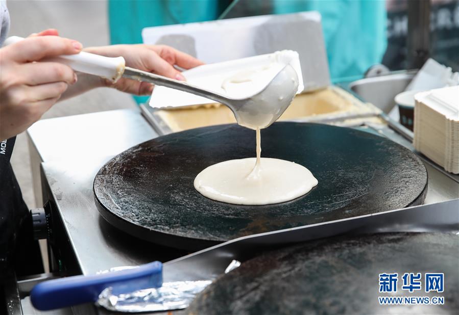 9月10日,在德国首都柏林,一名可丽饼摊位的工作人员将面粉液倒在平底锅上。